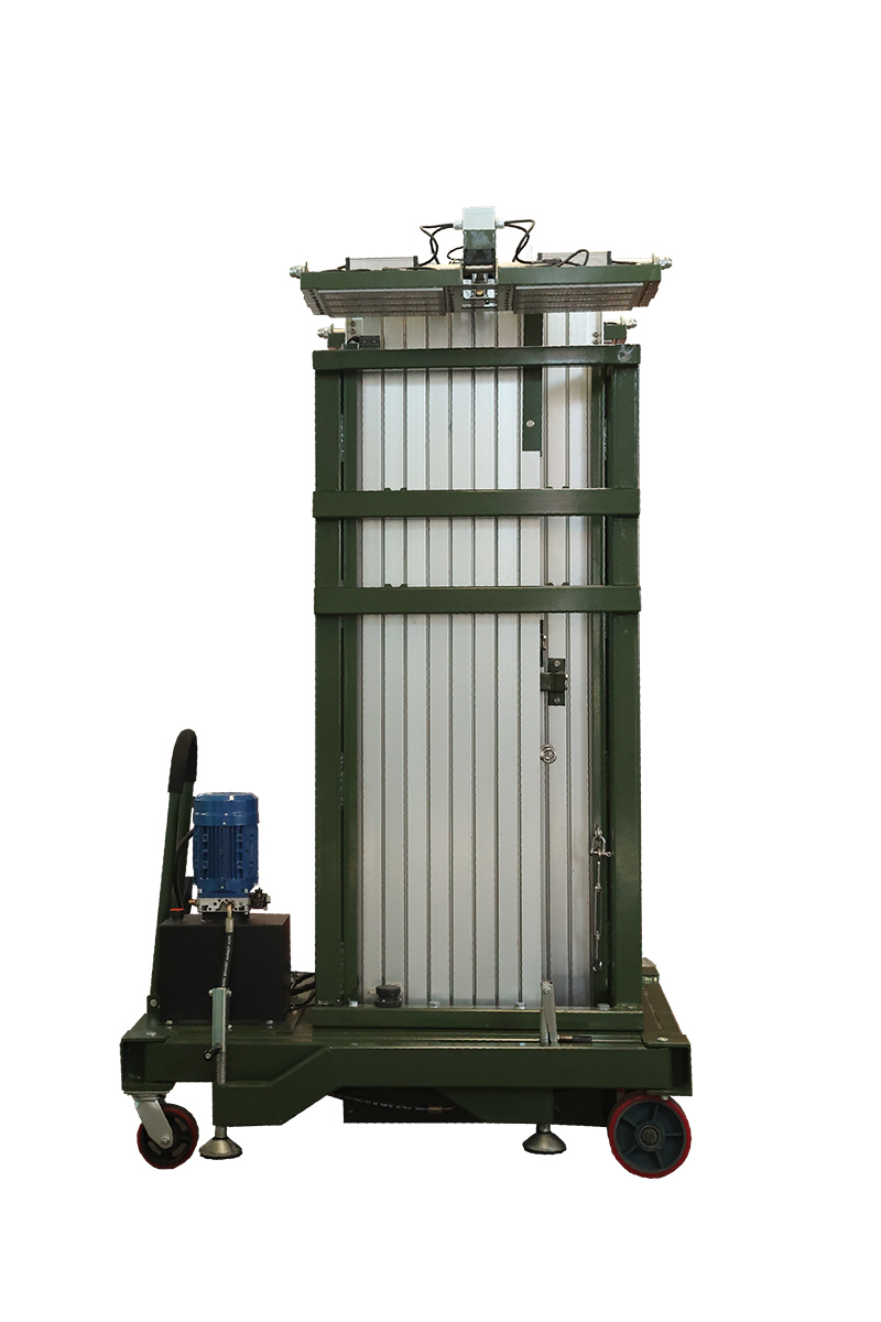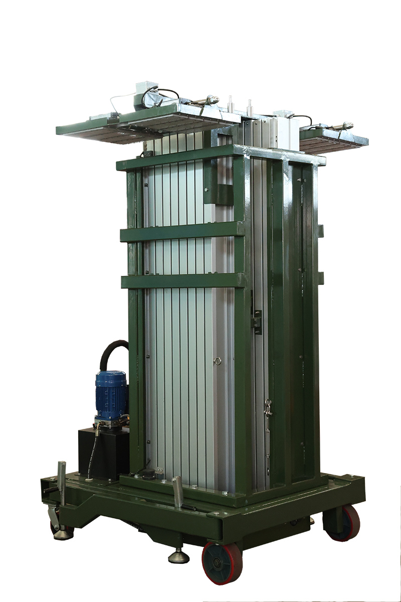 1.設(shè)備底盤采用高強(qiáng)度錳鋼管加工焊接制作,保證設(shè)備在升降過(guò)程中的穩(wěn)定性。 2.舉升機(jī)構(gòu)采用高強(qiáng)度鋁合金制作(渤海鋁業(yè)),具有良好的抗風(fēng)性能。